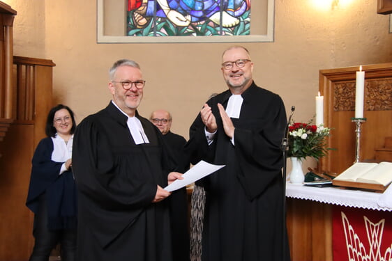 Nach der Beauftragung und Segnung zum Dienst an Wort und Sakrament durch Christof Grote, überreichte dieser außerdem Urkunde und Geschenk an den neuen Prädikanten.