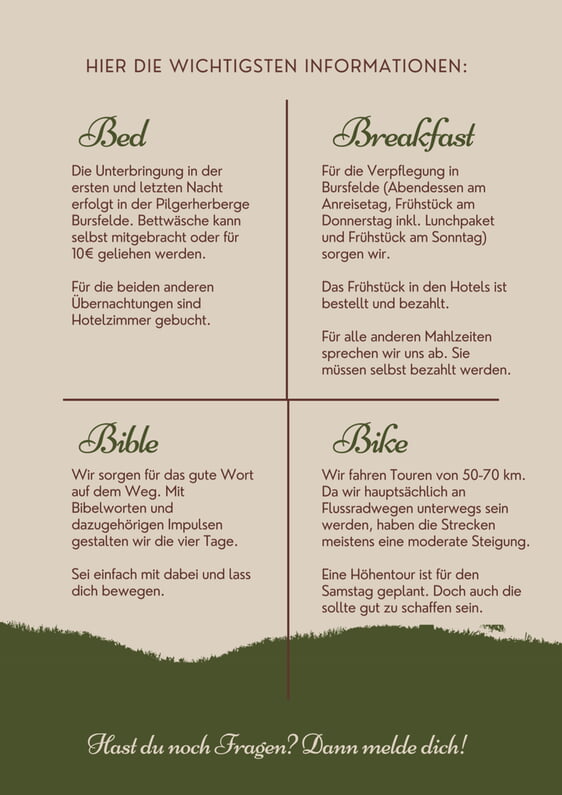 Wir sorgen für das gute Wort auf dem Weg. Mit Bibelworten und dazugehörigen Impulsen gestalten wir die vier Tage. Sei einfach mit dabei und lass dich bewegen.